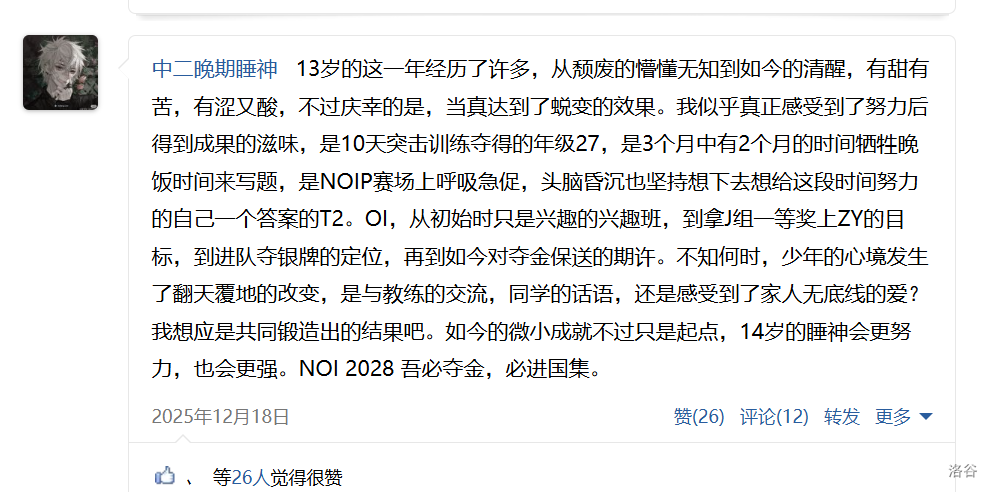 - 是赛前集训前的认真对待,而不是初一时的敷衍摸鱼,是每日动辄一两千字符的总结,是三个月的时间中牺牲了至少六十多天的晚饭时间,是多数在机房过零点的时刻,是午夜街头奔跑的身影,是顶住了CSP 2025发挥不理想的压力,在NOIP 2025赛场上绽放出的绚烂烟火!