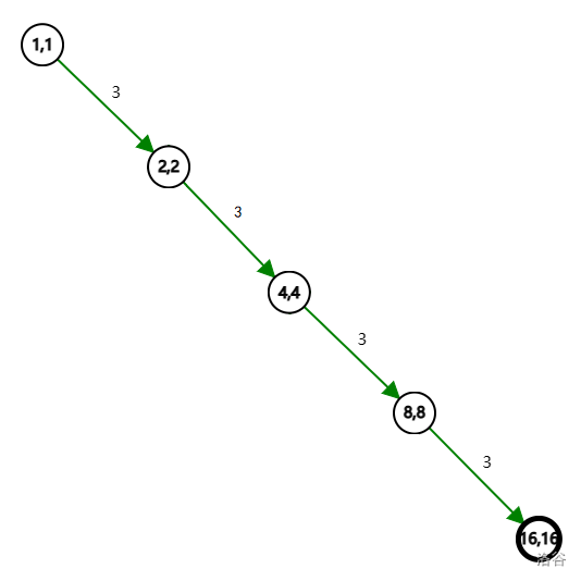 对于正方形优化中的压维 ST 表 ,我们发现它只包括了对角线上的节点,通过向右下的有向边转移,其转移图为: