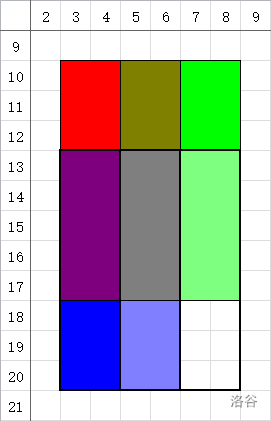 接下来考虑查询操作,设要查询的矩形为 ,先在 上划分出两个长度为二的幂次的块,例如 划分为 和 ,然后在 上继续划分即可,总计需要查询 个块。下面的图展示了如何查询 :