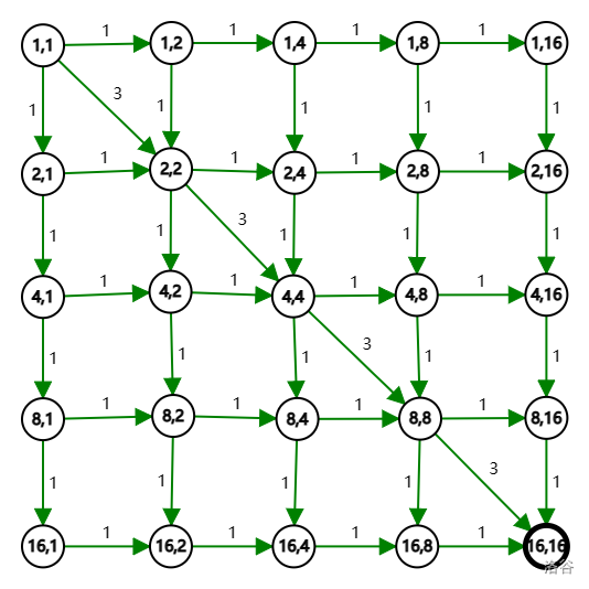 注意,这张图省略了主对角线外的斜有向边,例如 就被省略,事实上可以通过这些隐藏的边转移。