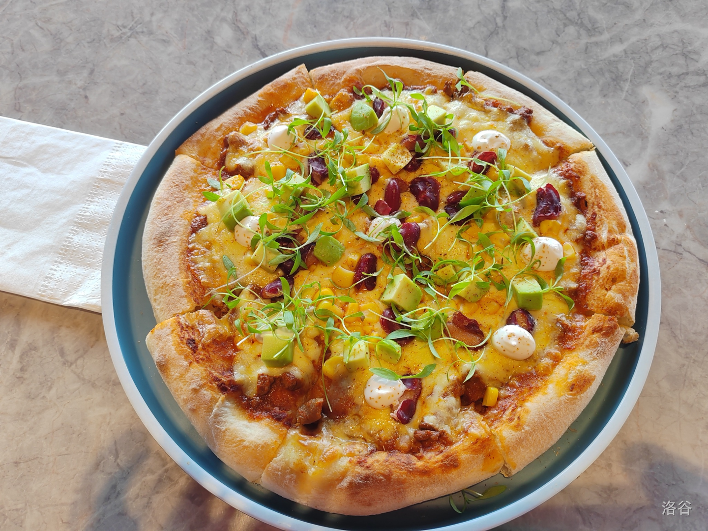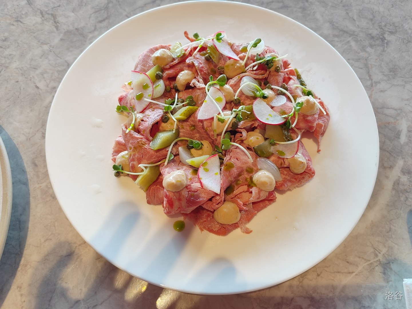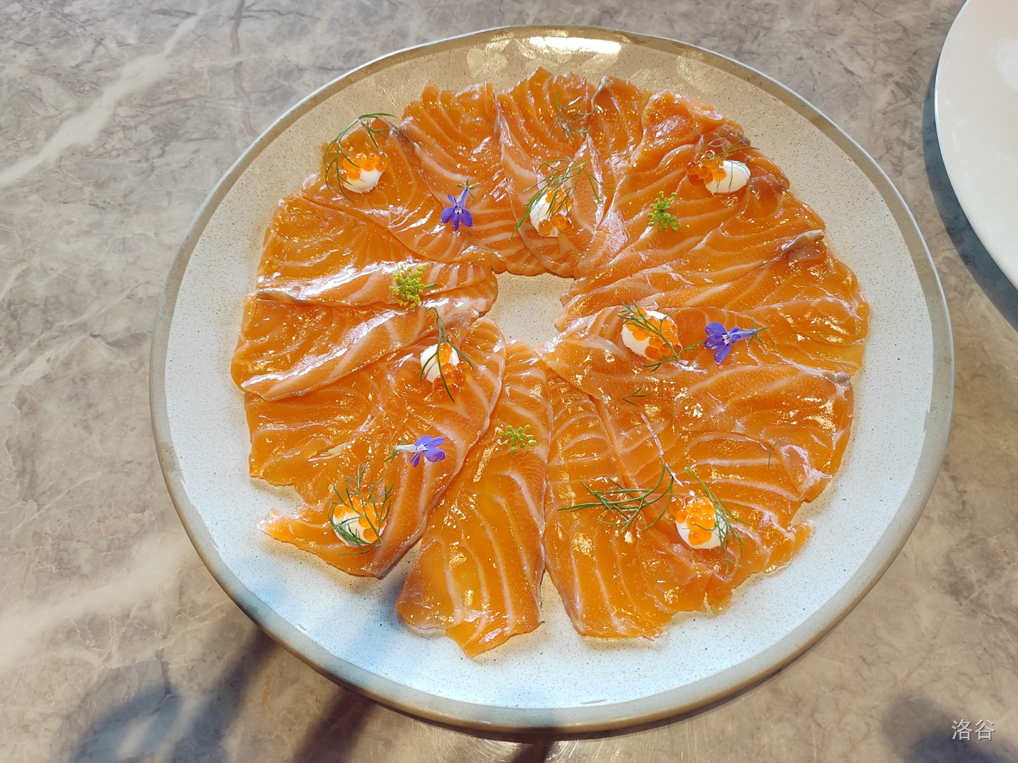 然后闲逛+和我校东方众吹水到了 12 点多,该找地方吃午饭了。于是在楼下的 8 楼看了一圈,但是其实是我不太想吃的类型,比如云南菌子火锅。因此我回到了 9 楼,发现在同一楼有一家看起来还不错的西餐店叫 eat n work。于是就直接进入了该店。这家店的物价比较陆家嘴,比较便宜的一餐估计也是要 200+ 元。我点了一个烟熏三文鱼、一个薄切牛肉、一个披萨和一个甜品,合计消费 442 元。味道的话还可以,总体算不上惊艳。