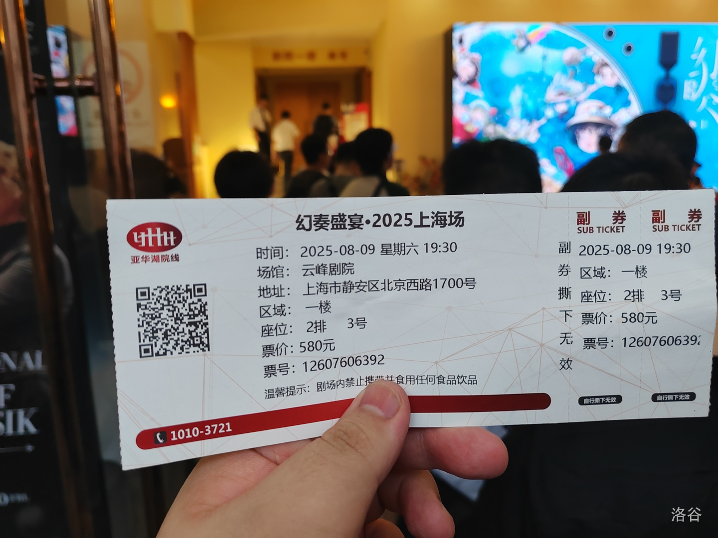 正是因为有过云峰剧院的观影体验,因此,当我得知幻奏要在云峰剧院办的时候,其实我是觉得,场地似乎……不太行?这个场馆办音乐剧、舞台剧还不错,因为设备够用,且场馆档次没那么高,安排的座位够多,会是一个很性价比的选项。但是对于一个交响编组来说,这个场馆的设备可能会有点拉、声学设计可能没有那么好。因此在购票前我想了一下,我肯定不想要后排的性价比票(80、280 元),但是这个场馆的设施和声学设计我不太会考虑买 980 元的所谓的黄金体验票(这里点名 团子),因此购买的是在正常情况下听感并不最佳,但是最前排的 580 元票。事实证明,我是对的。我的运气足够好,拿到的是前排正中间的票,且场馆的设施确实使得本应体验更好的位置的效果不尽如人意。