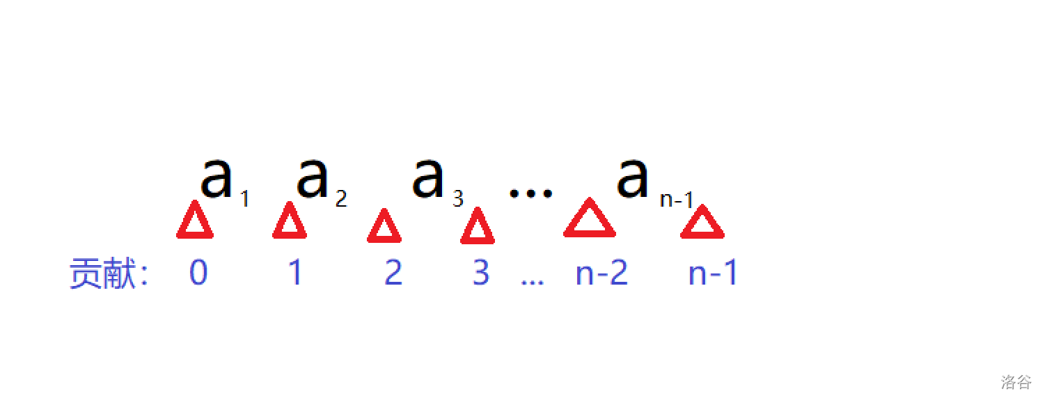 如图,将 的增加视为向这个排列内插入一个 ,算上该序列的头尾,共有 个位置可以插,插在第 个位置上的贡献即为该位置前方元素的数量,即 (因为这时 一定是最大的,前面的所有元素都比它小,后面的所有元素都没它大,所以只对前面有影响)。因此该排列下插入带来的贡献为: