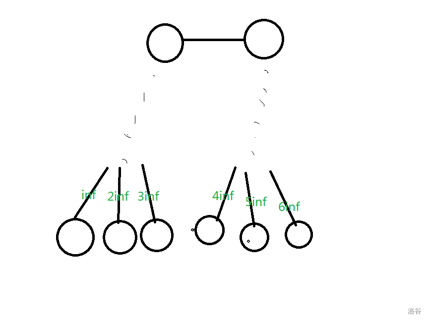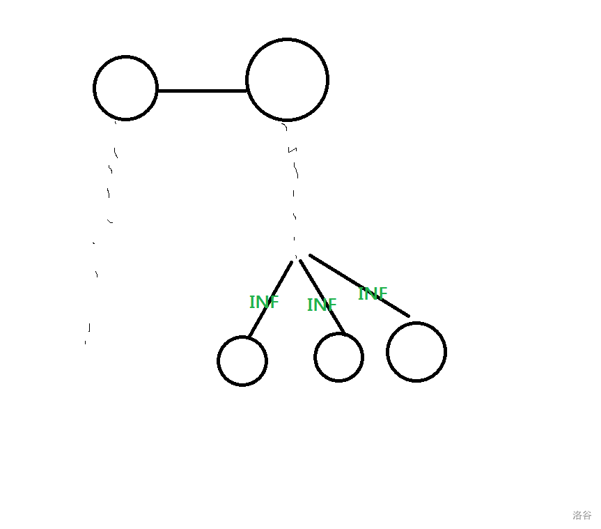 若编号最大和次大的点分别在两边,则可以先找到一个已经确定的点,使得这个点不是这两个点中任何一个点的祖先,把这个点和父亲的连边设为 INF,最大和次大的点和父亲的连边同上,要确定的边设为 INF,就可以用同上的方法确定。
