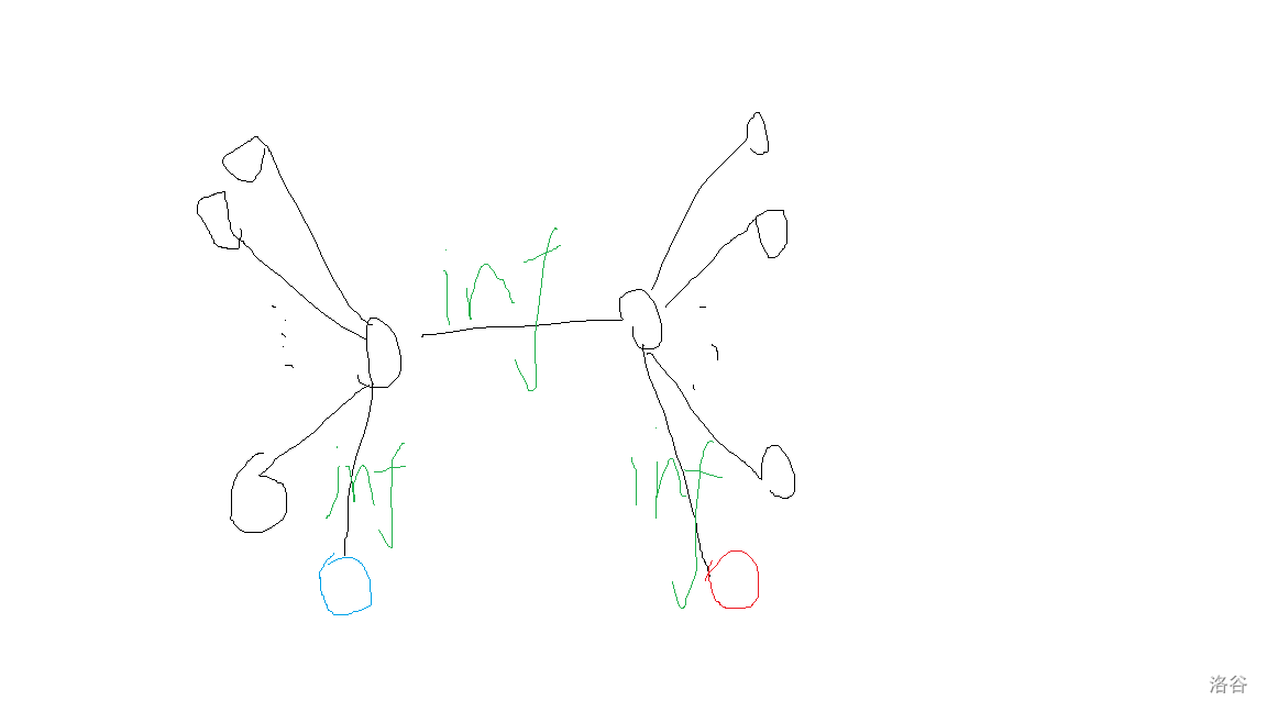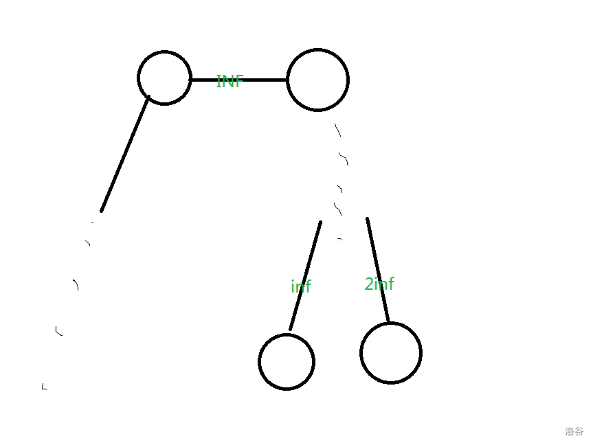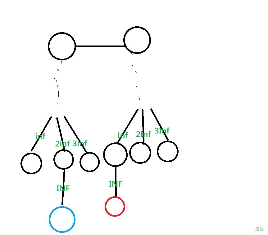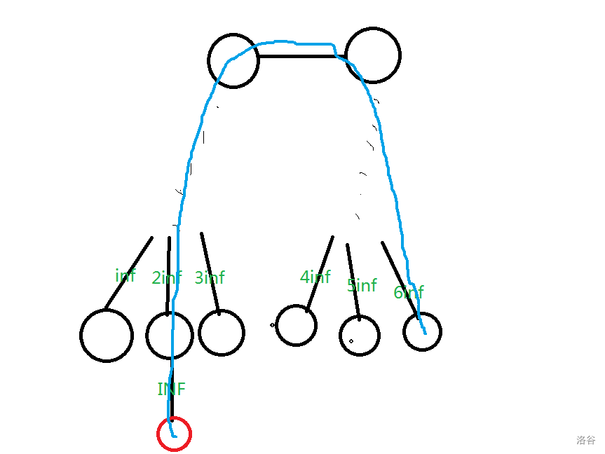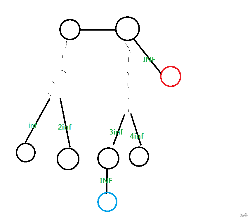 假如我们已经确定了这一层的第一个点,则可以将这个确定的点作为上图的红点,但是不同的地方是当红点和蓝点接到同一个点上时,求出的直径减去两个 INF 后为 。