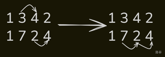 而我们可以发现交换第一排的火柴顺序与交换第二排的火柴顺序的代价相等,所以我们可以固定第一排的顺序,仅计算第二排要使其与第一排的大小相对顺序相等的最小代价即可