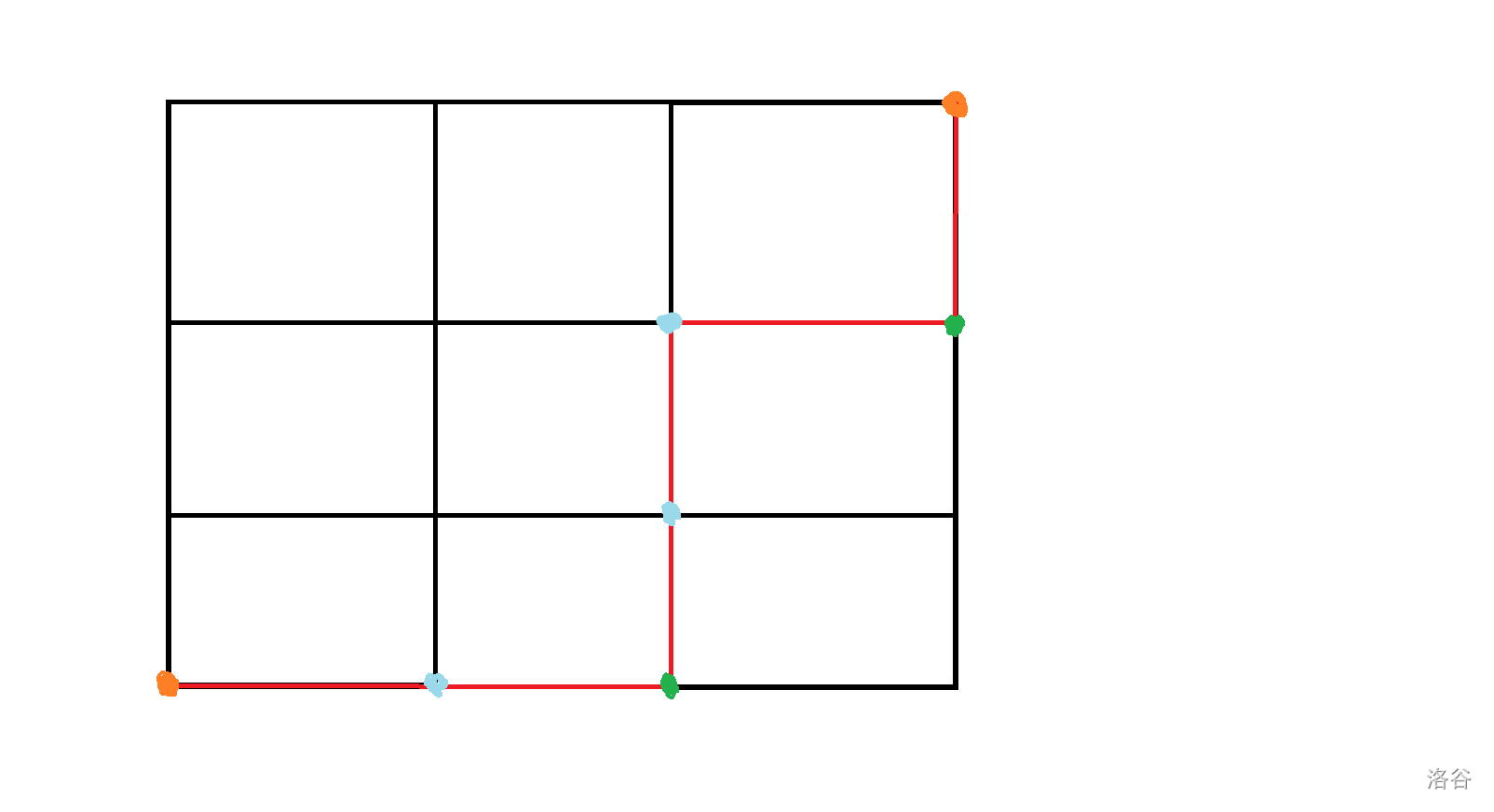 我们定义使路径方向发生改变的点叫做拐点。容易发现,拐点可以分为两类,一类是使路径从右变上,一类是使路径从上变右。我们发现,当我们确定了这两类拐点中的一类拐点时,这一条路径就被唯一确定了(相邻两个拐点类似于一个正方形固定了对角的两个点,所以这个正方形就被唯一确定了,所以这两个点的路径也就被唯一确定了)。