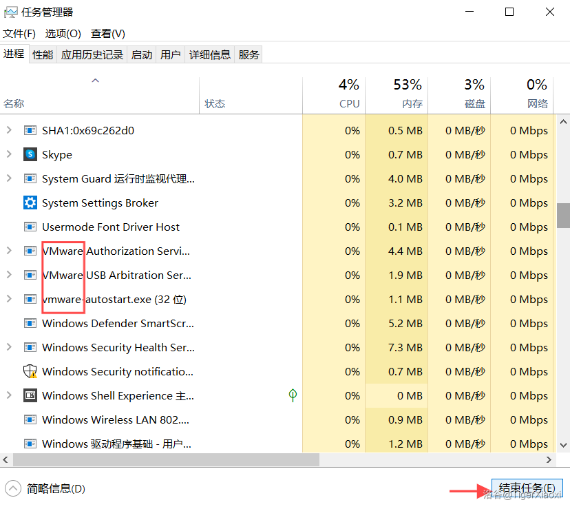 工具使用之前要先关掉VMware,后台的VMware进程也要清理干净。右键开始图标,在弹出的窗口选择“任务管理器”,然后往下滑,找到名字带有VMware的进程,全部都右键结束进程。等一会儿,如果有重新弹出来的,也结束掉它们,直到没有一个VMware进程为止。