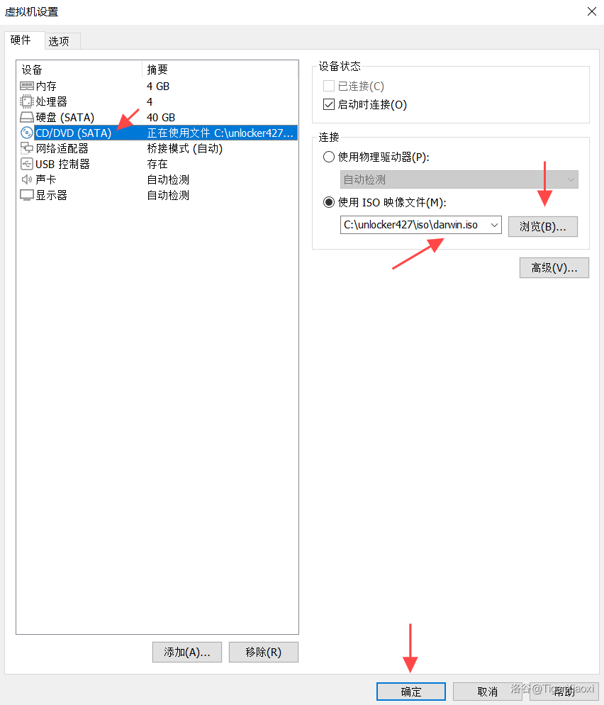 然后将你的虚拟机关机,点击编辑虚拟机设置,然后点击CD/DVD(SATA)把使用ISO映像文件指定为darwin.iso。