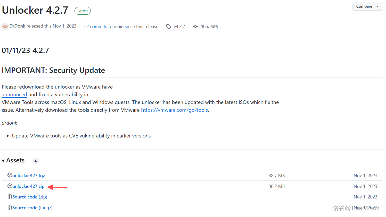 在官网界面,默认显示的是最新版本,下面有一个Assets,点击unlocker<版本号>.zip下载后解压。