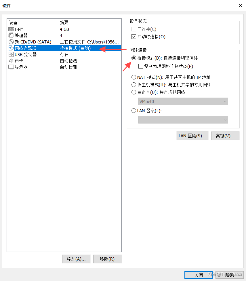 最后给虚拟机配置网络,点击自定义硬件,然后点击网络适配器,选择桥接模式:直接连接物理网络,然后点击关闭,点击完成。
