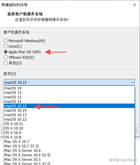 然后就到了选择客户机操作系统,如果VMware在没有使用Unlocker解锁的情况下打开,在选择虚拟机操作系统时就没有Apple Mac OS X的选项。