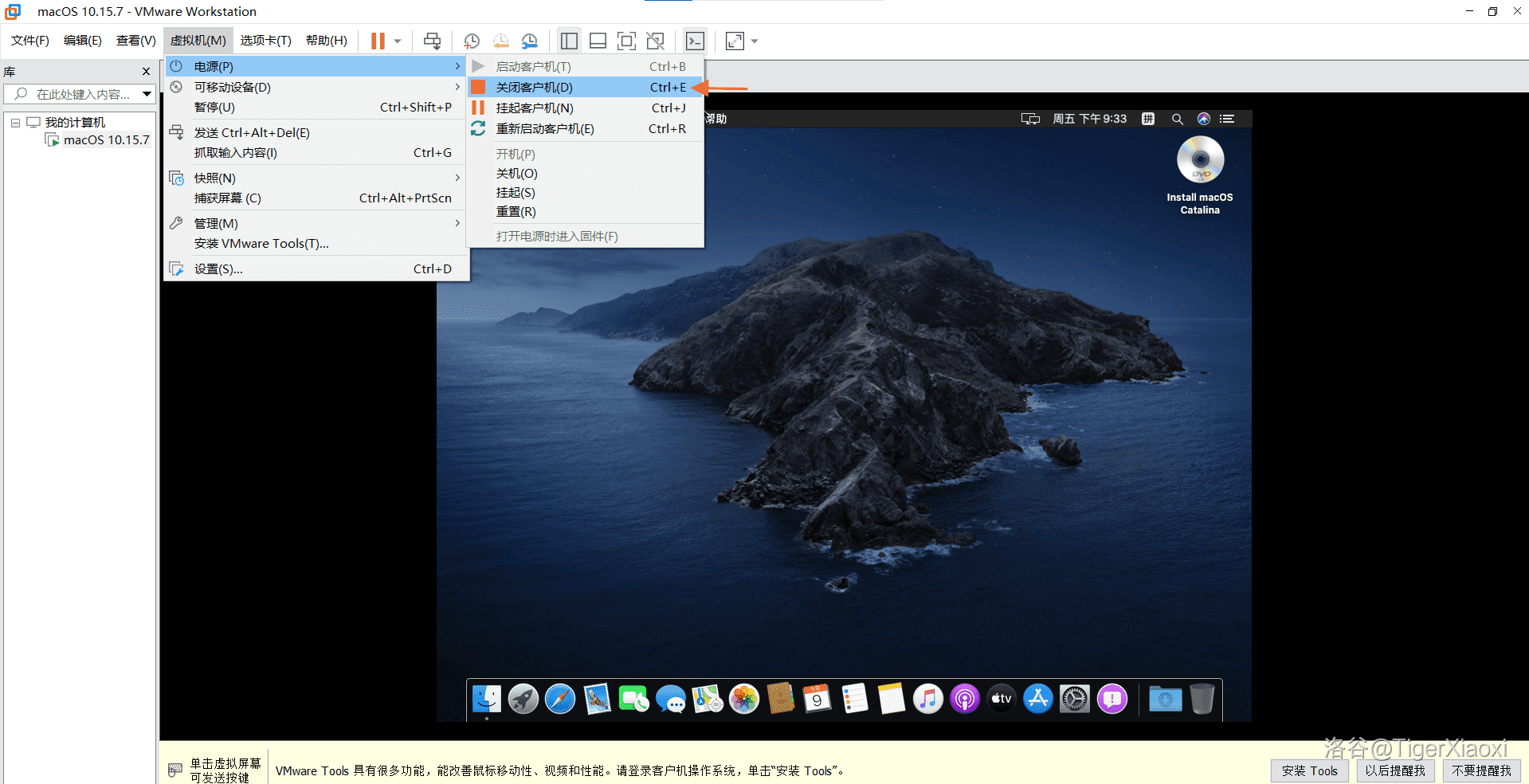- 点击左上方虚拟机选项卡,点击安装VMware Tools即可安装。