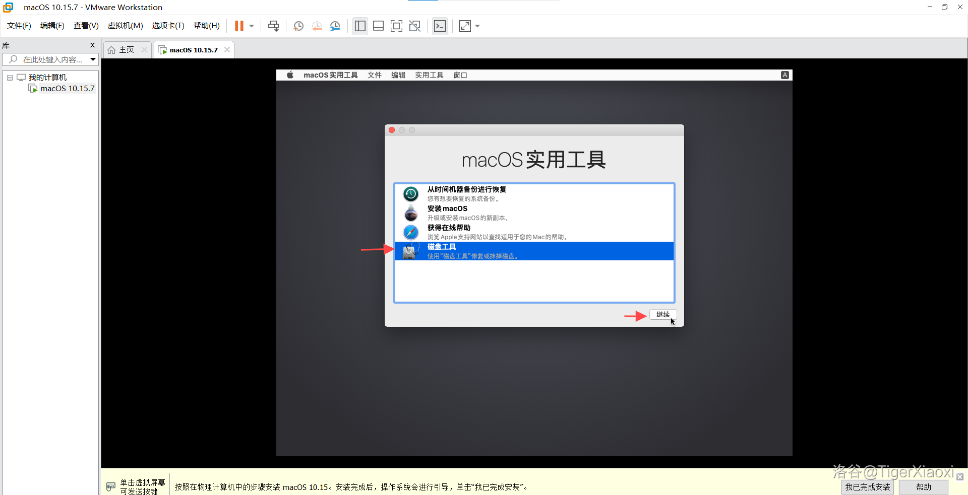 完成后点击左上角小红点,关闭磁盘工具,然后点击安装macOS,点击继续,点击同意,然后点击我们刚才抹掉的硬盘,点击继续,等待安装(大约 分钟)。