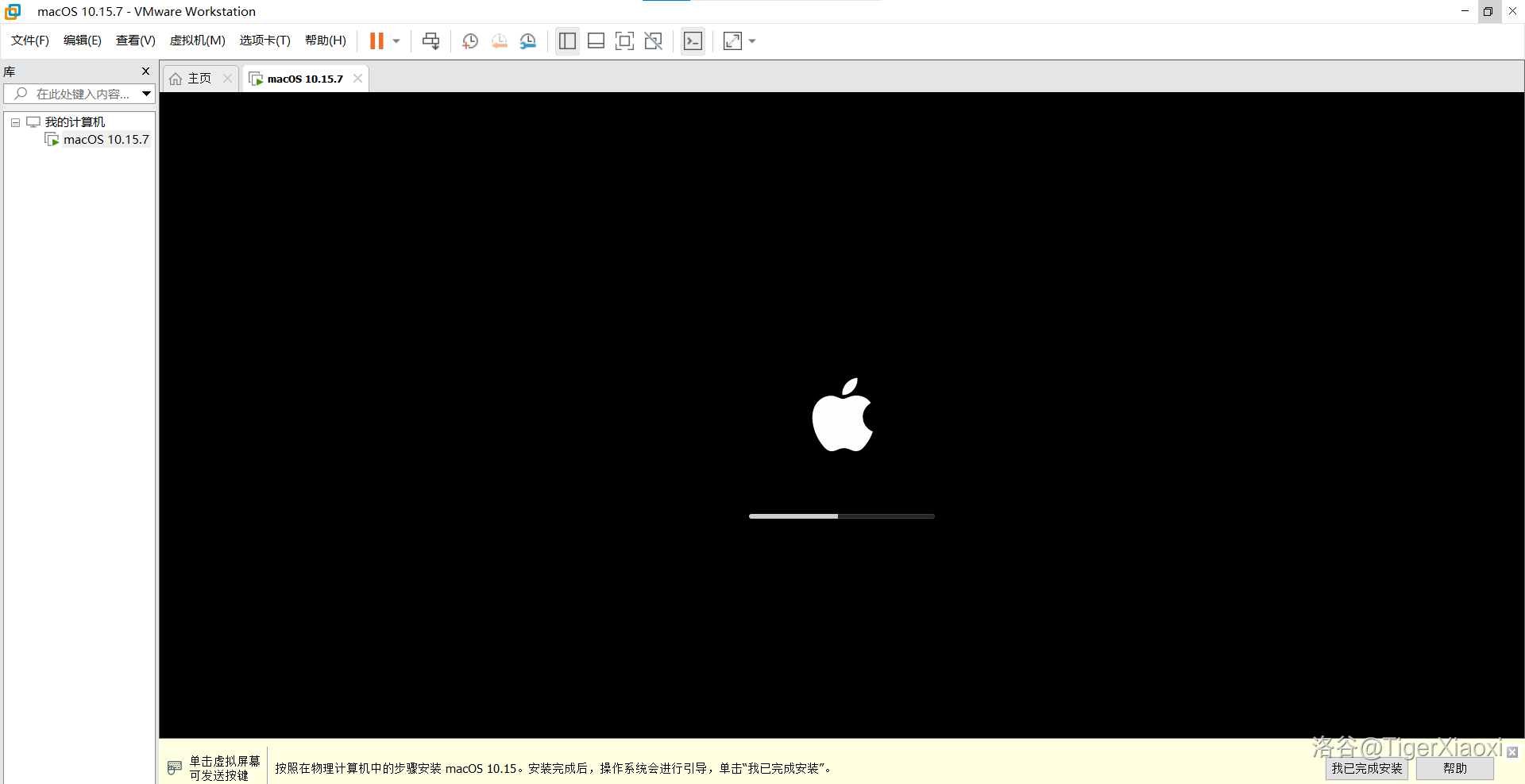 点击开启此虚拟机,如果出现了一个白苹果,下面有一个进度条,则说明成功了。(如果打开显示Boot Manager,下面还有一系列选项,那说明镜像文件不支持你的CPU,只能换个镜像重新弄,目前发现AMD不支持,Intel可以)