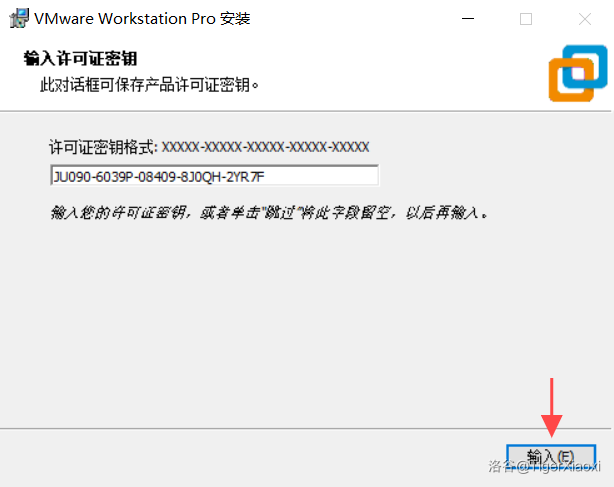 下载好后解压,双击安装程序,一直点击下一步,直到填写许可证的界面,点击许可证,许可证默认是填好的,点击输入,再点击完成就安装成功了(请注意,不要使用高版本的VMware)。