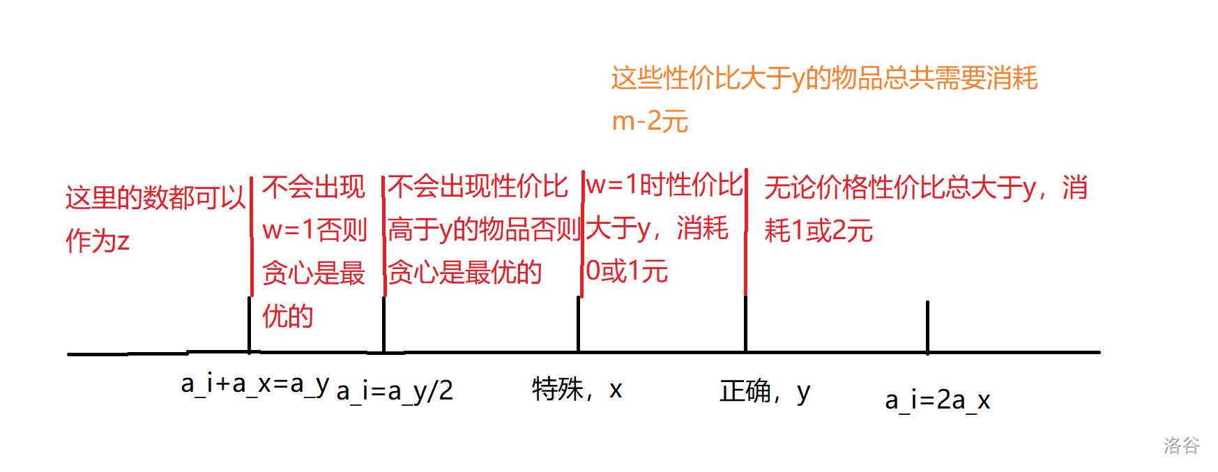 然后,枚举特殊物品 和正确物品 。正确物品的价值比特殊物品要高,但性价比更低,因此要保证 。