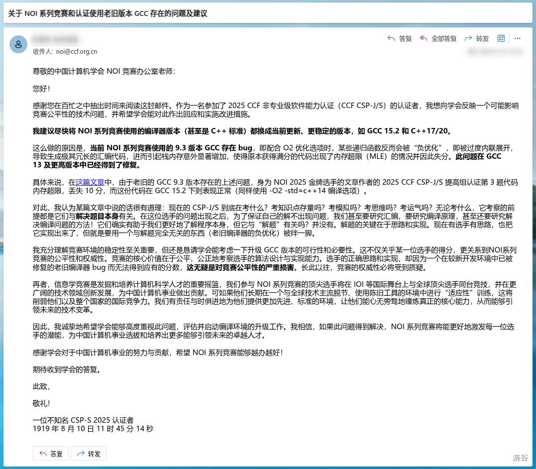 文中“这篇文章”的超链接为《CSP-S2025 游记:没人告诉我 NOI Linux 有编译器 bug 啊?》,“某篇文章”指的就是《不过对于普通选手的我们来说还有救吗?有的兄弟,有的。》。邮件中部分内容引自此文章,在此表示感谢。“某篇文章”没有超链接是因为怕 CCF 看到对他不好的话而感到愤怒然后给你禁三。