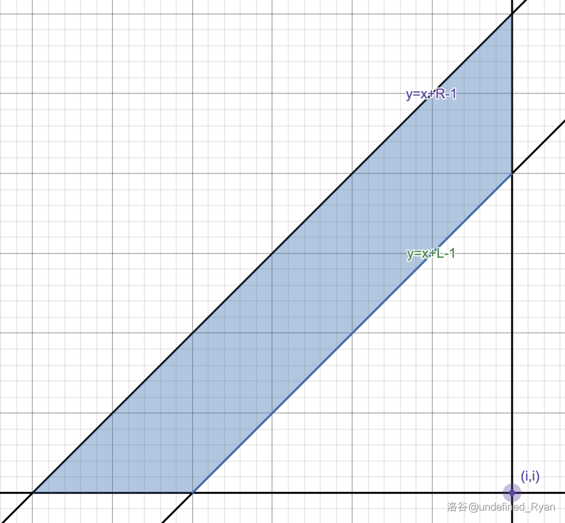 这个梯形似乎没有什么很好的性质。但我们注意到对于一次询问的所有 ,两条倾斜直线都是不变的。也就是说,如果基于这两条直线构造平行四边形,就相当于一个 RMQ 问题,可以使用单调队列求解,例如: