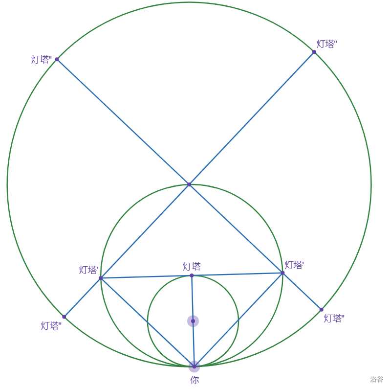 不断重复将灯塔与圆心连线并与更大的圆相交于两点的操作,容易知道,这些灯塔的效果与原灯塔仍然等效,他们的光照强度总和仍为