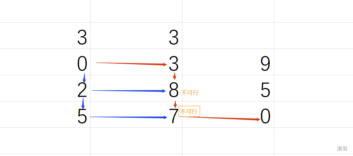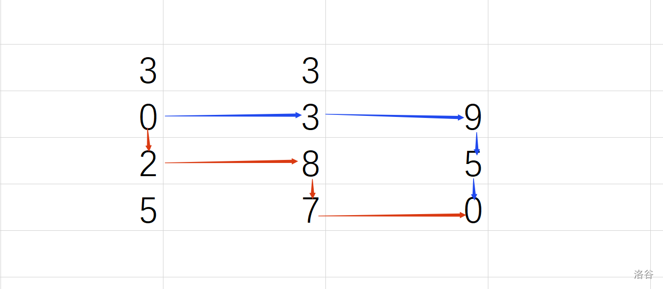 用dp实现就是计算目前的最大值。于是要表示两张纸条的坐标,可以定义f(i1,j1,i2,j2)为当前最大值。所以推状态转移方程: