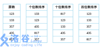 标准的基数排序每次从小到大排序十进制下的一个位,并且只关心这一个位,例如下图