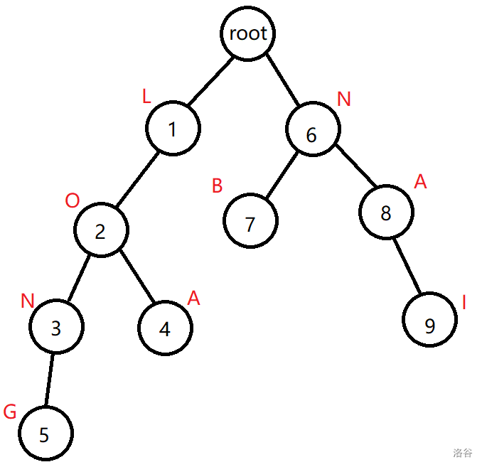 其中每个节点中间的数字是节点的编号,它们旁边的红色字母是他们的权值。
