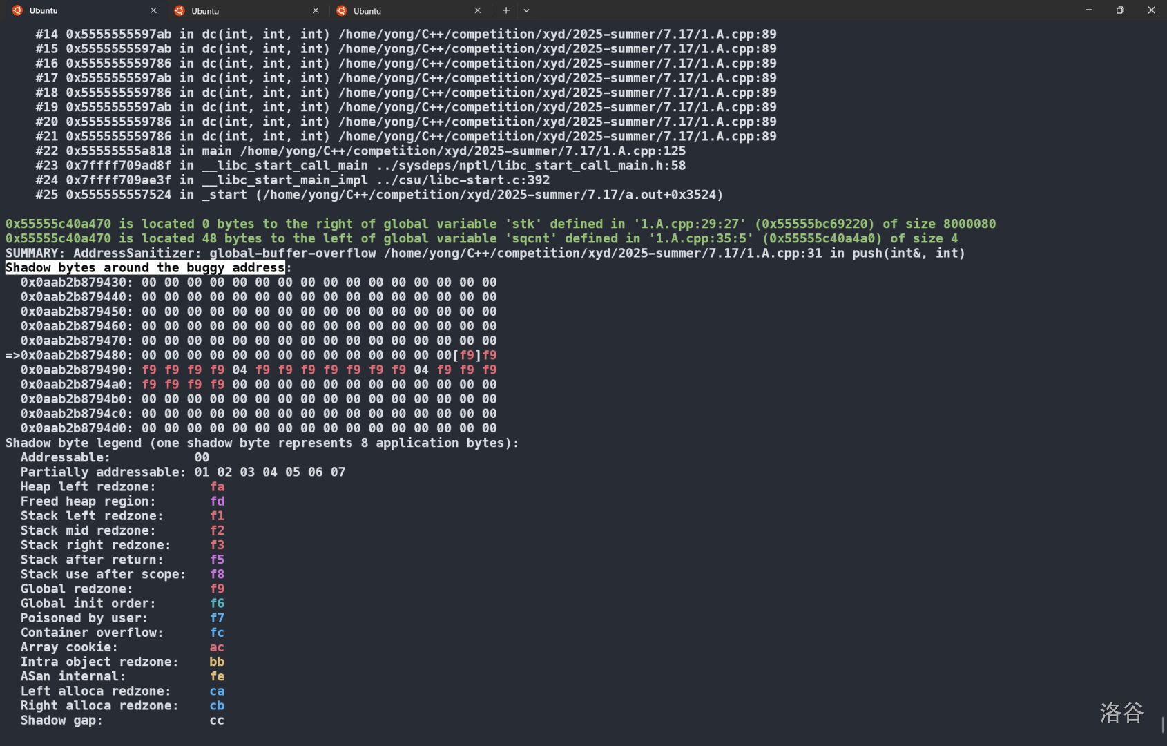 就是他可以检测数组越界,然后一下就找到哪里出问题了虽然绿色字下面的就看不懂了,还有其他种类的溢出也可以检测,非常的好用啊。