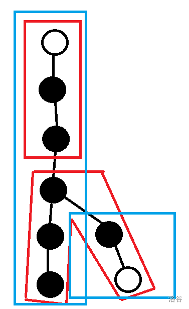 但是发现你无论如何染色,总有一个时刻上面的链的白点回到上面的一端,那么不管下面的链是什么状态,我们都可以再把树分成图上两条蓝色的链去操作,从而下一次得到的操作就不唯一了。