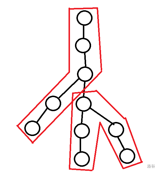 那么接下来就可以 dp 了,上面的分析我们可以看成,我们需要把树分成若干条链,满足每条链的长度 ,链头和链头相邻,链中与链中相邻。