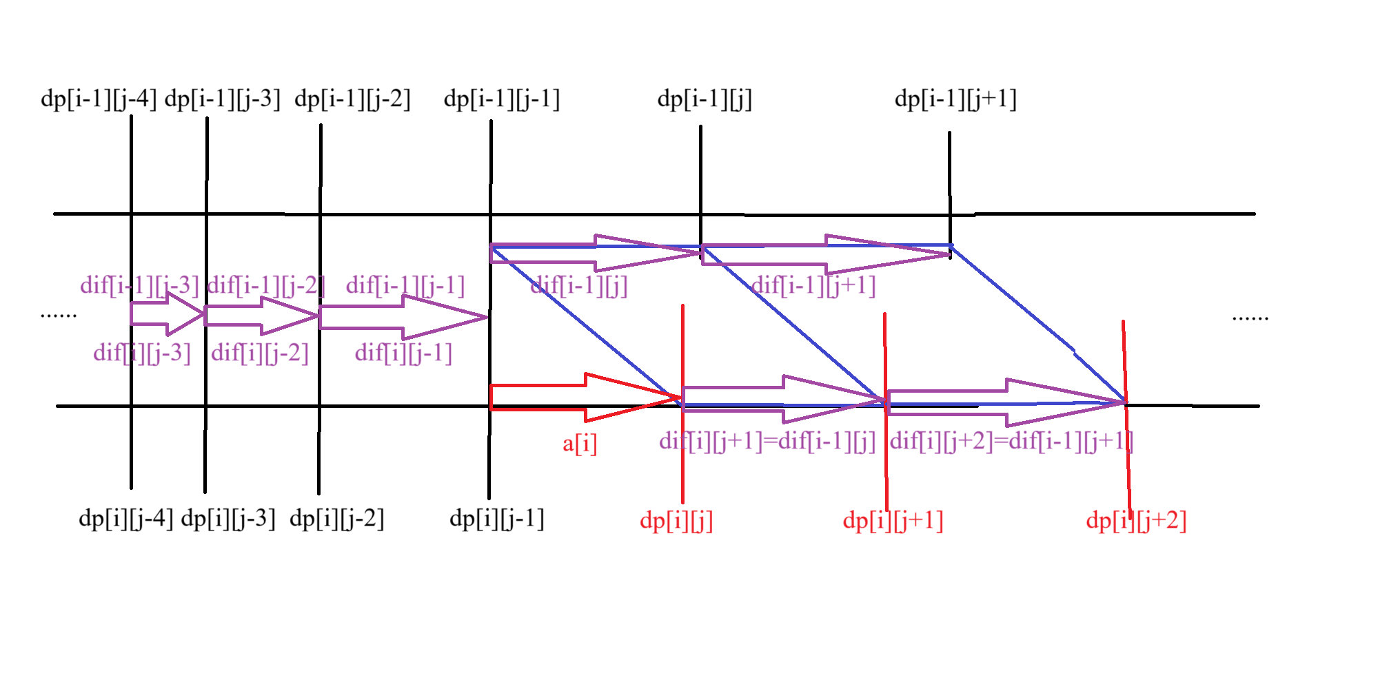 根据图可以发现,差分数组 difi,ji+1∼difi,i 本质上只是在差分数组 difi−1,ji+1∼difi−1,i−1 中插入了一个 ai,插入的位置 j 满足 difi−1,j>ai≥difi−1,j−1。