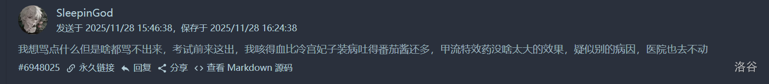 - 考试的时候,我那个键盘是坏的,然后监考给我换了一个键盘。然后我的喉咙一直在痛,很痛的那种绞痛,脑袋也晕晕的,胃也是很痛,想T1想的很快最多10min,但是测完样例什么的就开场50min了,因为我的NOI LINUX只会基本操作不是说特别熟的那种,本来是想NOIP前两天弄一下的但是我生病了。