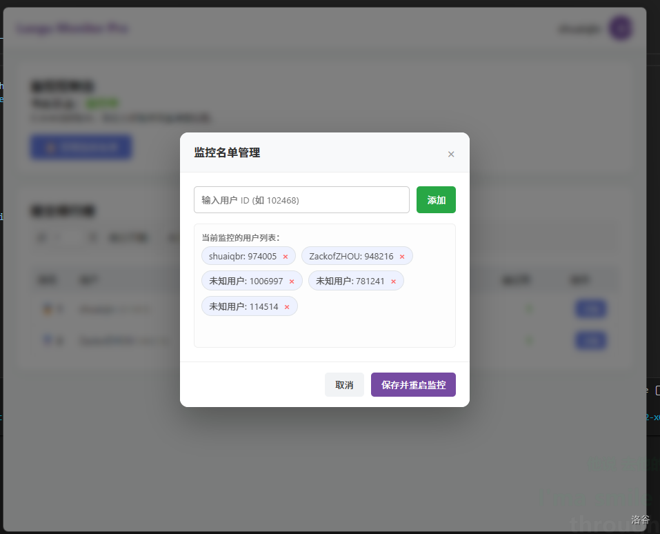 - 用户ID监控:通过输入洛谷用户ID,轻松添加用户到监控列表
