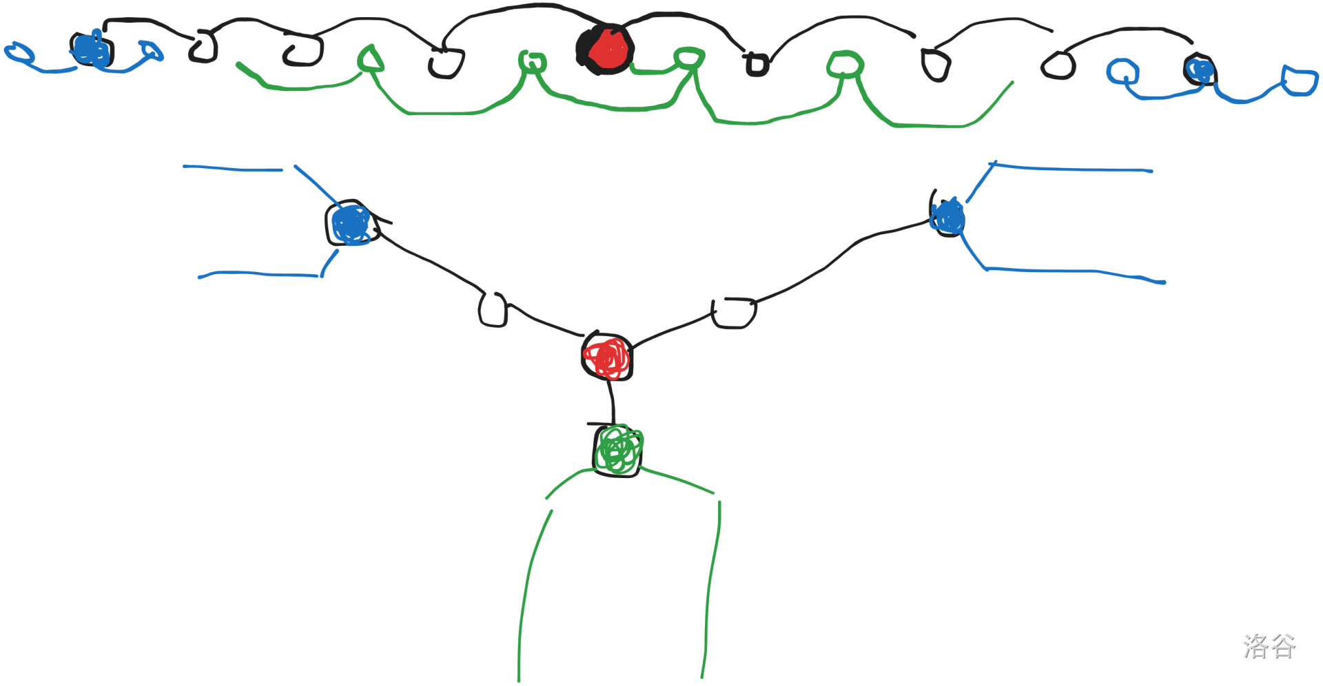 这个时候三四度点已经不一定在一条链上了,但是还可以补救一下。注意到可以找到一条链使得所有三四度点距离它的距离不超过 1。我们取出这条链(可以看作是直径),认为不在链上的三度点如上图所示被捆绑在了距离它为 1 的三度点上,那么只有直径端点的捆绑可能有问题,稍微讨论亿点点情况即可。