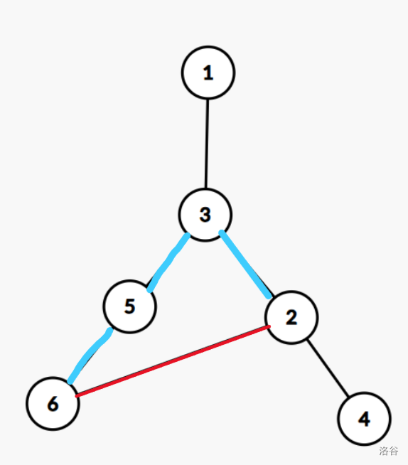 发现当我们把任意一条蓝色边删掉之后只要把红色边加上就可以让树重新联通,因为他们整体构成了一个环。