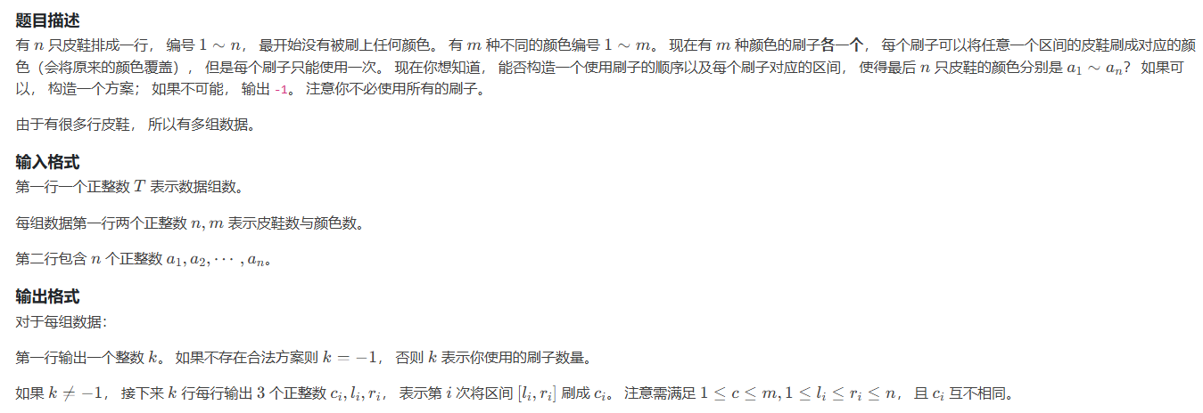 因为颜色只能用一次,那么我们在遍历的时候就要像剥皮一样一层一层找出此时应该涂什么颜色,我们每遇到一个新颜色就记录下它出现了,若之后的颜色与当前最高层颜色不同且在之前已经出现过,则肯定无法完成涂色,输出-1,否则继续进程。