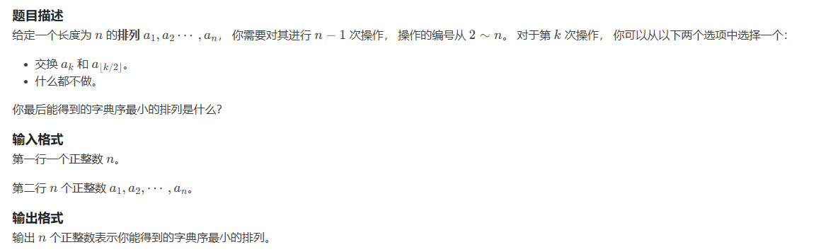 之后,就是三个数的情况,首先是A仍是最小值,那么就还好,如果是中间的这个数是最小值,那么直接和A交换,没有其他的方法让它扔到前面去。不过如果最后一个数是最小值的话,那就有很多情况了,我们会出现CAB和CBA两种情况,且都是合法交换而来,怎么保证字典序最小呢,由于我们目前的任务是将A扔到哪去,所以我们现将A,B两者小的分别放到 , 上,然后比较两者最终所在位置前后,,如果一开始A就小于B,说明我们就是拿A交换的,直接将res被较小的结果赋值,否则的话,我们还要再考虑一层,要将A扔给那个最终得到的结果偏后的那种交换方案(方案分为两种,也就是我们之前提到的将A,B两者小的分别放到 , 上)。