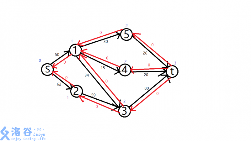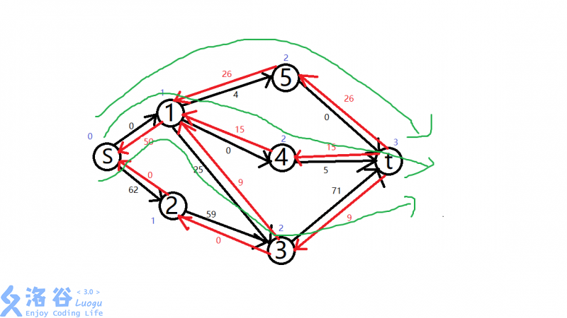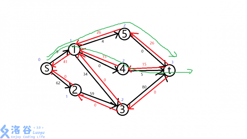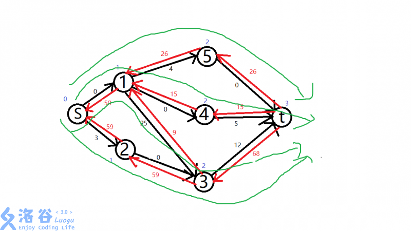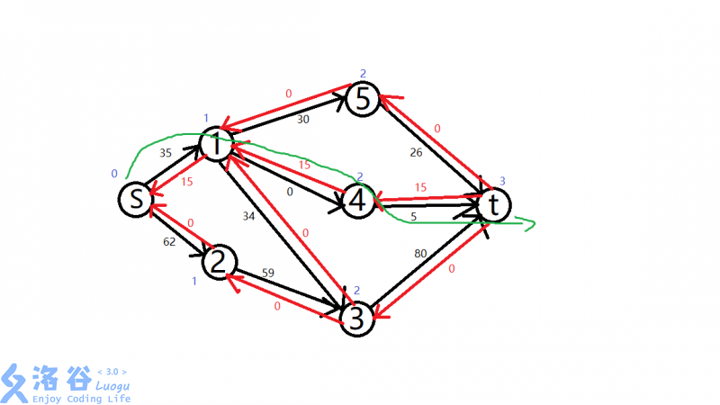有了分层,我们就不会选s->1->2->4->5->3->t了