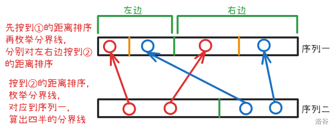 回顾我们最初的分析:按到 ① 的距离排序后,去 ① 的病人一定是一个前缀;按到 ② 的距离排序后,去 ② 的病人也一定是一个前缀。而我们之前枚举四个部分的分界线时,并未保证去 ② 的病人是前缀,导致效率低下。具体优化方法如下图所示(~有点不想写了~):