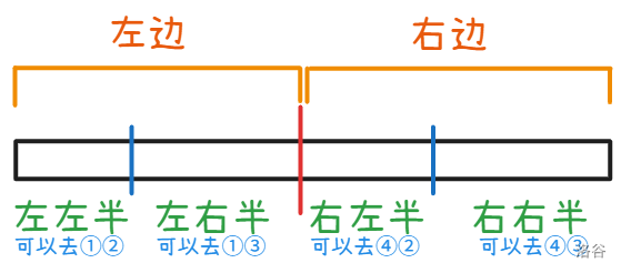 排序后,我们枚举左边去 ② 和去 ③ 的分界点,将左边进一步分为两部分:左左半(可去 ①、②)和左右半(可去 ①、③)。下图展示了左左半、左右半、右左半、右右半的划分: