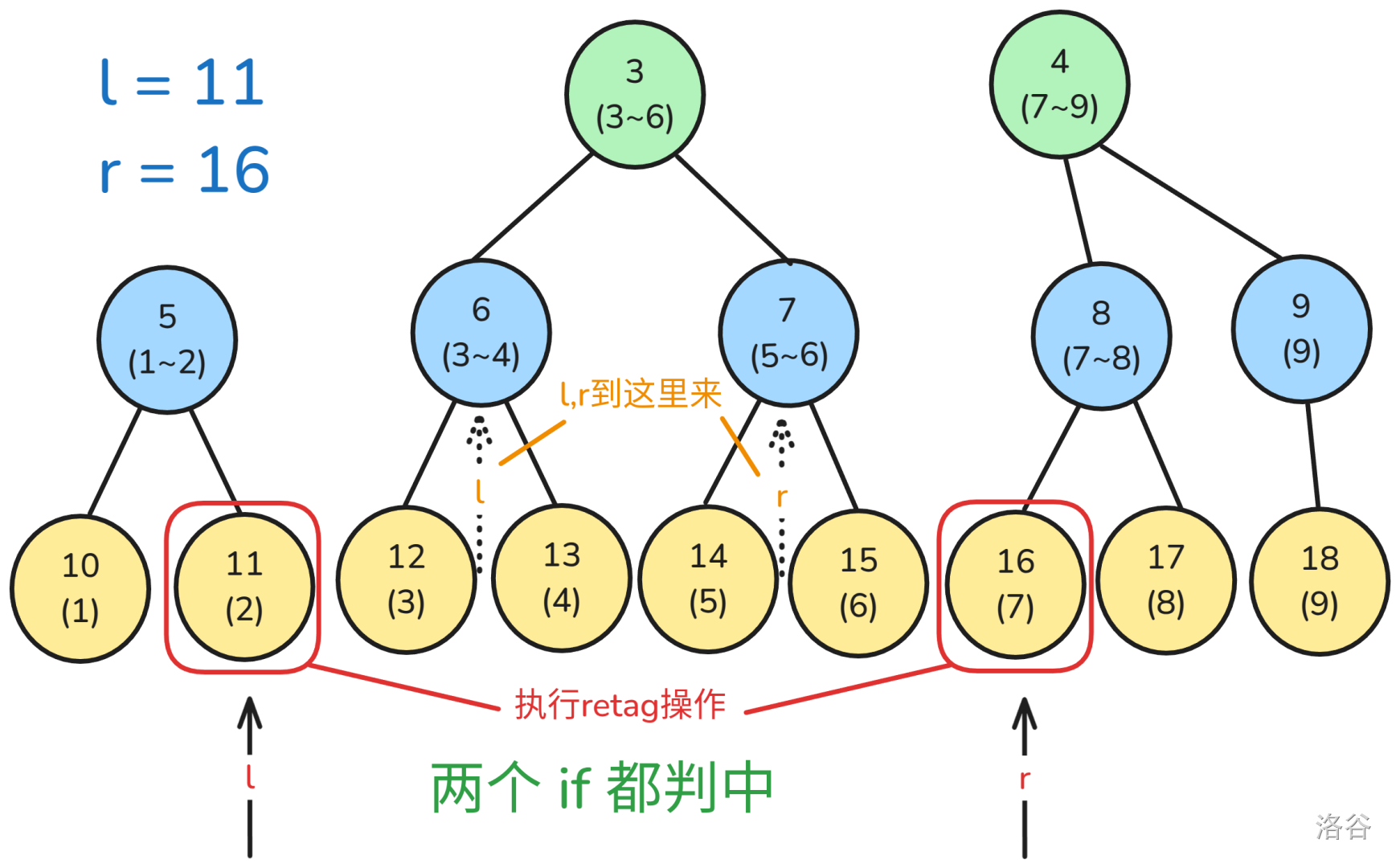 CPP//就是把散块做了,然后一直往上层递推,在l>r时停止。