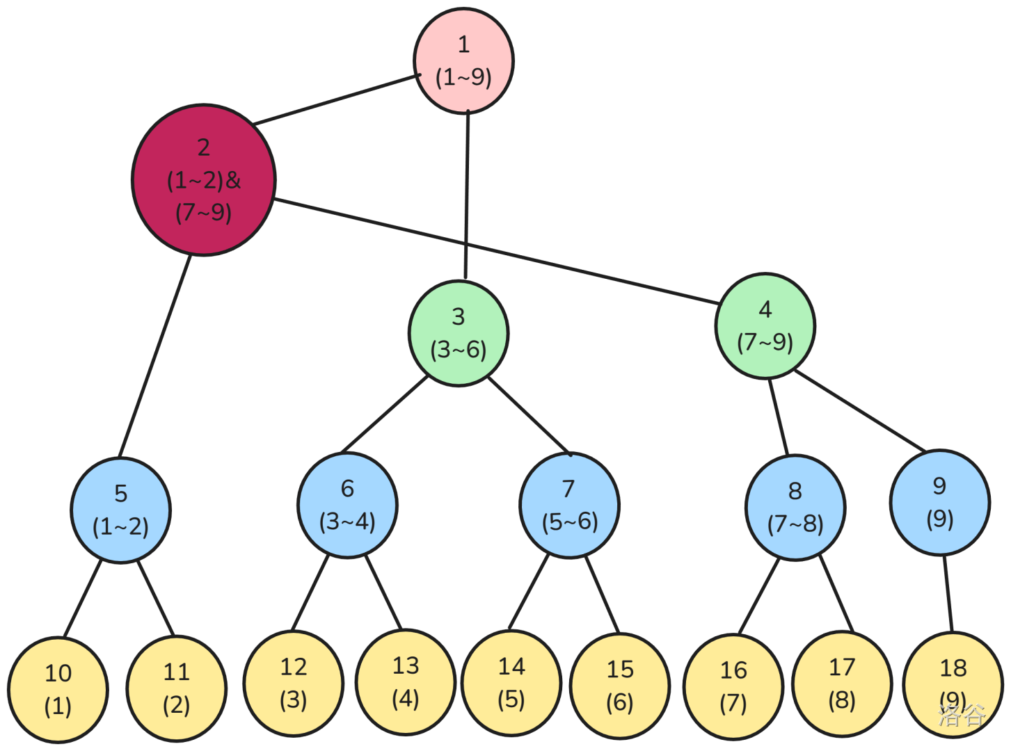 注意到节点二储存的区间并不完整,且包含的区间分布在左右两端,所以只要不是查询区间 就用不着。