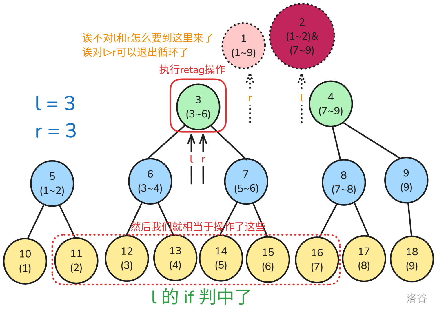 //就是把散块做了,然后一直往上层递推,在l>r时停止。