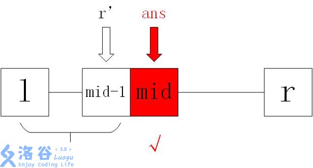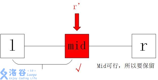 这里,当l==r时循环停止,此时无论输出l还是输出r都可以。取中点不讲。这里我们要保证l和r都是暂时可行的(没有证明不可行)的,所以**当mid被判定为可行时,r应该取到mid而不是mid-1,因为这里没有ans来记录,如果r取了mid-1,我们就永远丢失了mid这个可行解(mid永远取不到了),从而导致答案错误 **