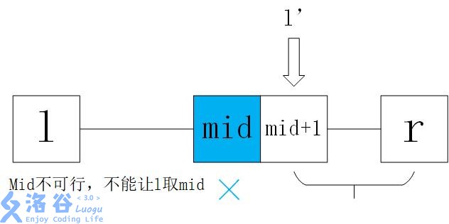 - mid不可行,此时令l=mid+1,找更大的解来满足条件