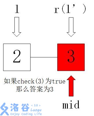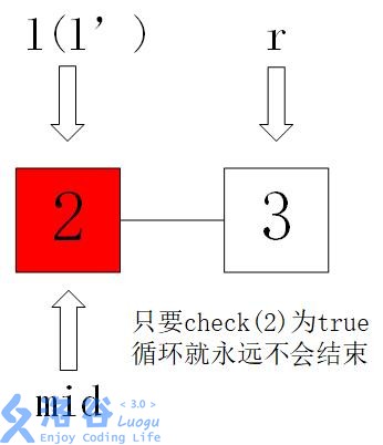 但是这个例子要注意一个特殊情况,如果l=2,r=3,mid=5/2=2,此时测试的check(mid)如果为true,那么l和r将永远卡在2和3,所以在此处,我们取的中点要靠右,也就是(l+r+1)/2,这样就能保证l和r不死循环