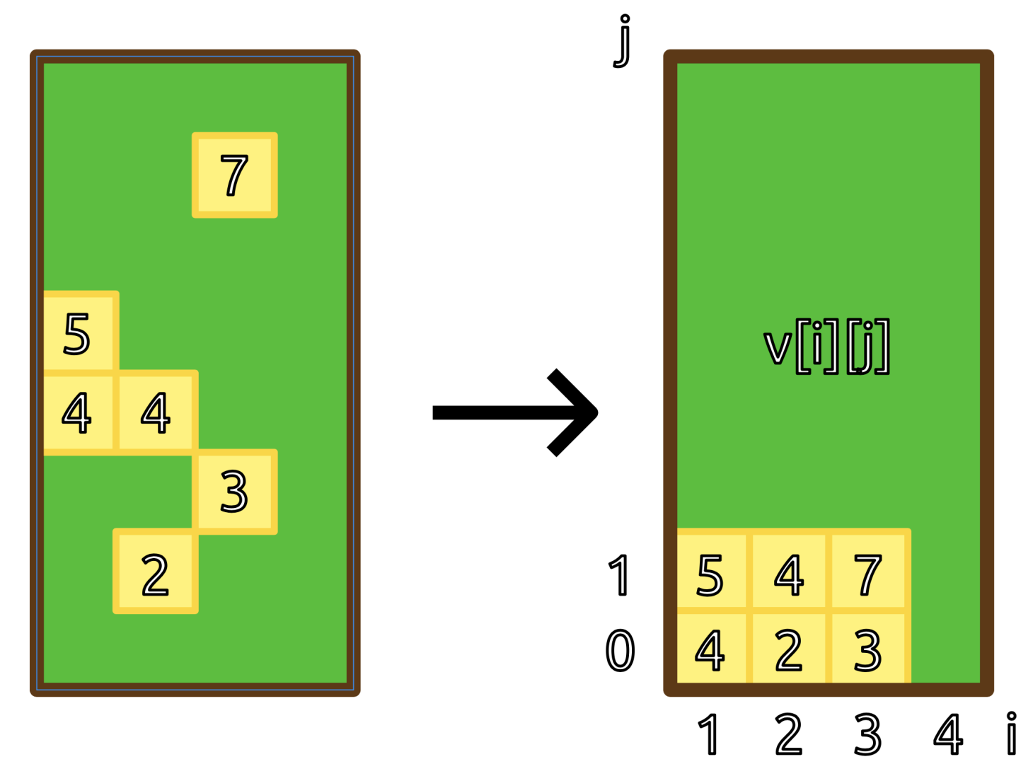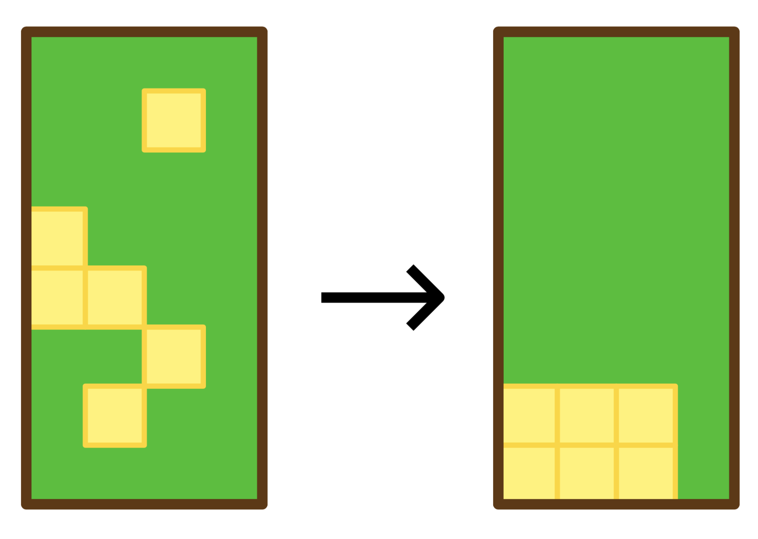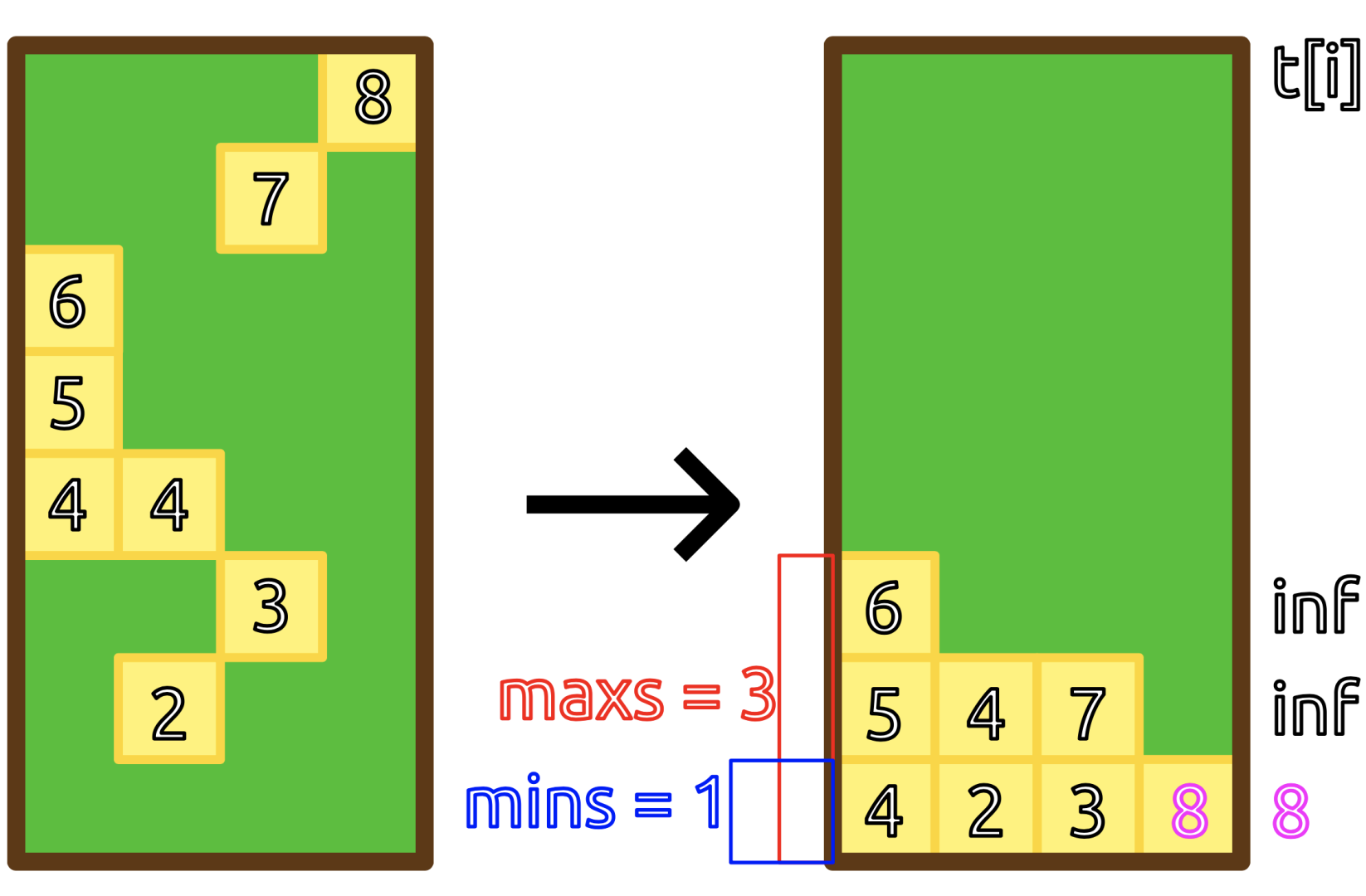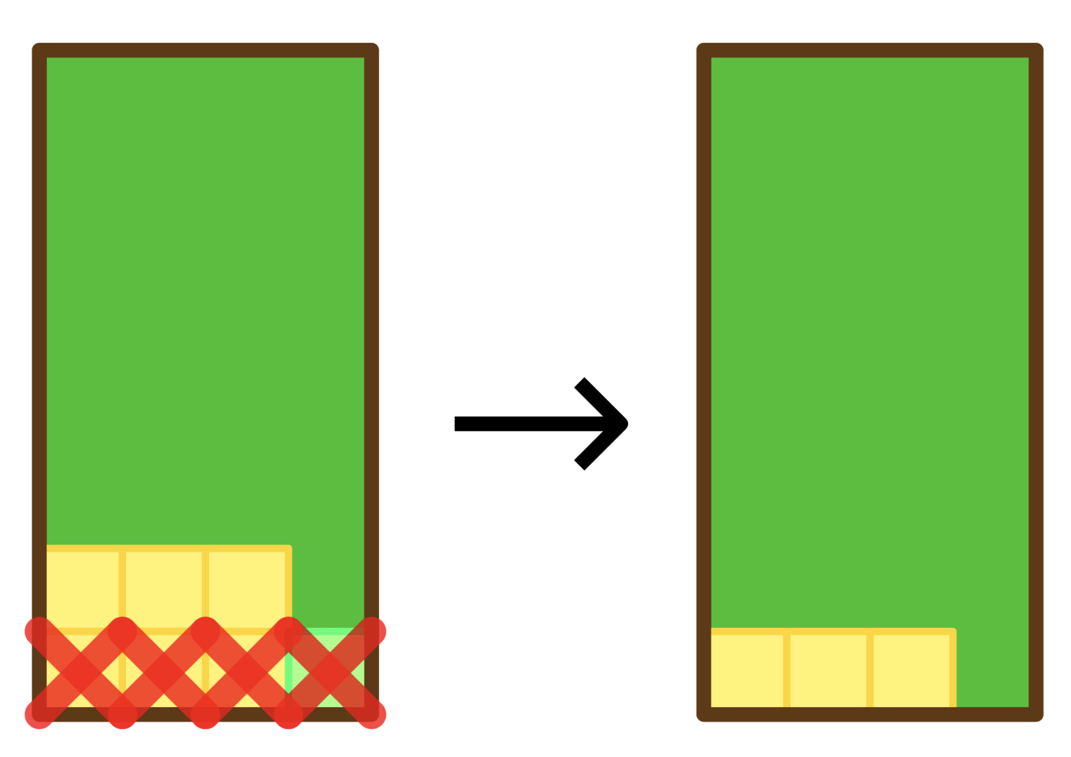 注意到落下的正方形们满一行才会被消除,之后的正方形才会落下来。所以能清除多少行正方形和正方形们初始的高度无关,而是等于同一个 中最少有多少个正方形。如图 所示,没有正方形会被消除: