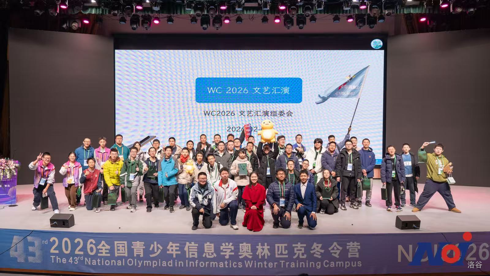 (上台)在帮助Tom大战Jerry、使用铅笔橡皮画树之后,我们终于迎来了2026noi最令人激动的环节,我是主持人几条鱼。接到主持词应当活泼而不失庄重的任务,请允许我再次庄重的向各位表示欢迎:尊敬的老师、亲爱的同学们、来自全国各地的信竞选手们,大家晚上好!话不多说,下面我宣布,2026noi冬令营文艺汇演,正式开始!