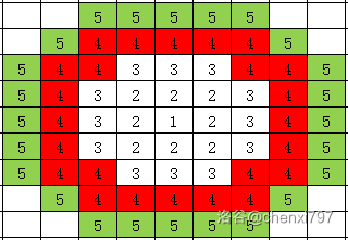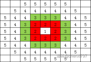 其中红色网格为前一秒的细菌扩散状态,绿色网格为当前秒细菌扩散状态。