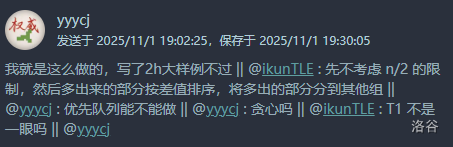T1感觉没有什么算法,于是我就贪了个心,居然50min就把大样例全部过掉了1。目前心态很好,于是去写其他题的特殊性质。
